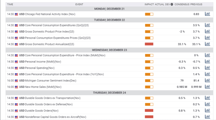 Stimulus: Talks between Republians and Democrats are set to continue over the weekend and potentially conclude before markets open. Failure to reach a quick accord would likely weigh on markets, but both sides seem on keen on sealing a deal before Christmas. Any boost before the new administration settles in would be market positive/dollar negative, but mostly priced in.