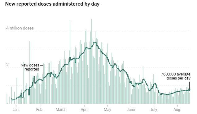 Rising coronavirus cases, hospitalizations and deaths weigh on sentiment, but there is also a silver lining – the pace of vaccinations has increased. Any additional uptick in the chart below could improve the mood, alongside a flattening of the covid curves in the worst-hit areas.