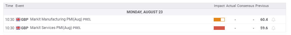 The economic calendar is relatively light toward the end of the summer, but Markit's preliminary Purchasing Managers' Indexes for August stand out. The downgrade of the Services PMI in July caused sterling to dip, and another slip in sentiment in the UK's largest sector would also be worrisome. Nevertheless, any score above 50 represents expansion, and it would provide hopes for ongoing growth.