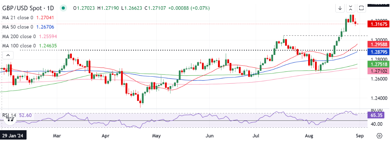 GBP/USD extended the previous week’s winning momentum and recorded a 29-month high at 1.3266, as the US Dollar downside gathered steam in the early part of the week. US Federal Reserve (Fed) Chairman Jerome Powell’s dovish remarks at the Jackson Hole Symposium on August 23 continued to ramp up dovish expectations surrounding potential interest-rate cuts later this year, exacerbating the pain in the USD.