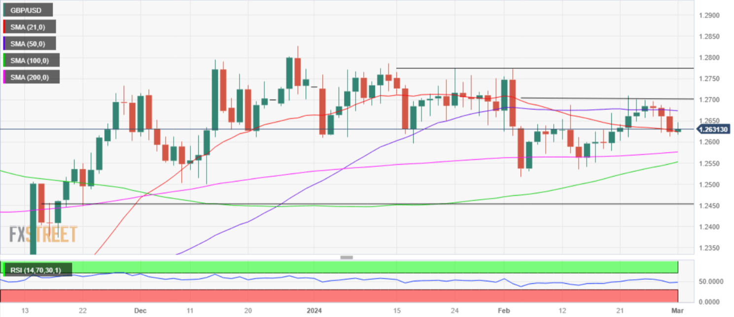 The pair is clinging to the 21-day Simple Moving Average (SMA) at 1.2622 after having faced rejection at 1.2700 on multiple occasions.