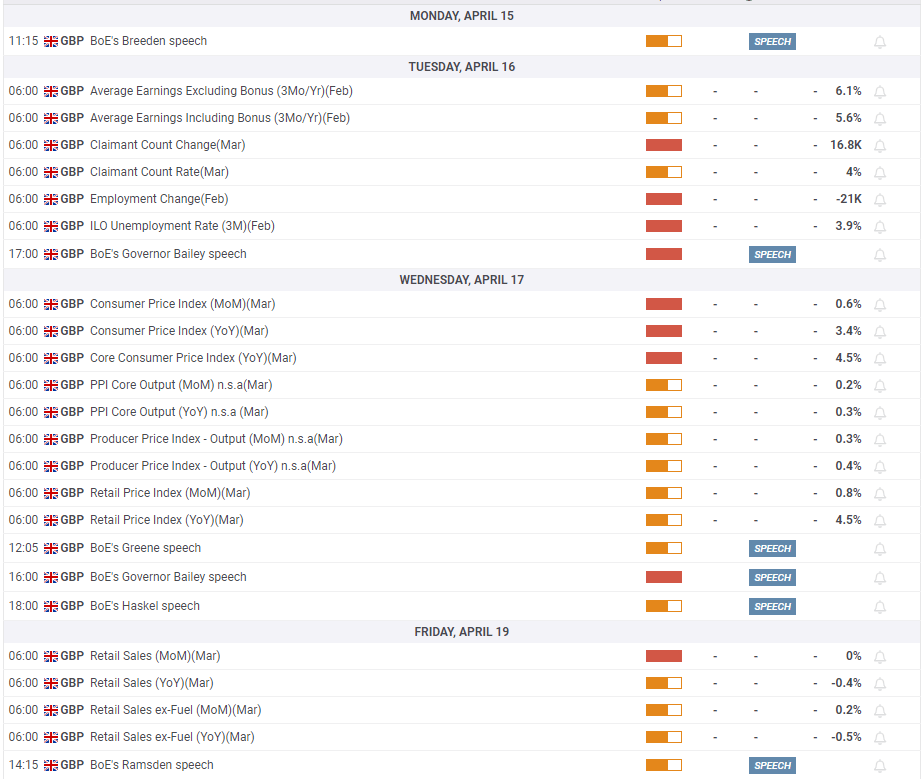 The UK jobs report is scheduled for release on Tuesday. Later that day, BoE Governor Andrew Bailey will speak at the International Monetary Fund (IMF) Spring Meetings.