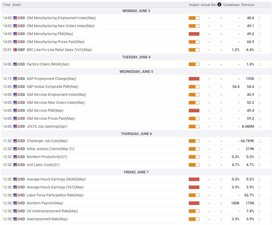 US ISM Manufacturing PMI will hog the limelight on Monday ahead of Tuesday’s JOLTS Job Openings survey. Wednesday will feature the key US ADP Employment Change data, followed by the ISM Services PMI.