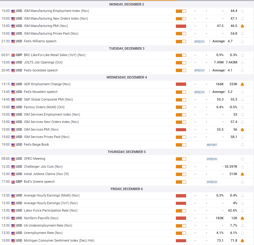Speeches from several Fed policymakers will be listed throughout the week and could be significant as the ‘blackout’ period kicks on Saturday ahead of the December 17-18 policy meeting.