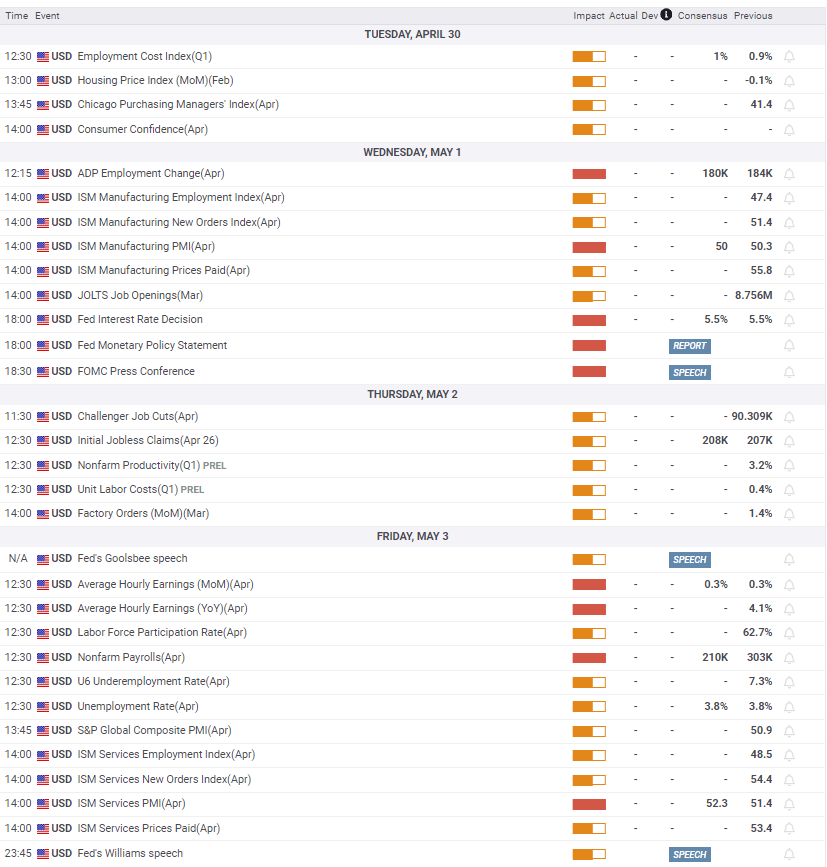 Monday is devoid of any top-tier data releases from both sides of the Atlantic. The focus, thus, shifts toward Tuesday’s quarterly release of the US Employment Cost Index for Q1 and the Conference Board Consumer Confidence data for April. China’s official Manufacturing and Non-Manufacturing PMI data will be also reported early Tuesday, which could have a reasonable impact on risk sentiment, eventually influencing the demand for the safe-haven US Dollar.