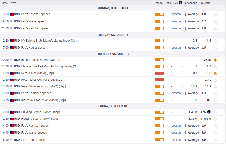 Wednesday will feature the UK CPI data for September, which will have a significant impact on the BoE’s interest rate move in November, as well as on the Pound Sterling. On Thursday, the US Retail Sales report will be published alongside the releases of the weekly Jobless Claims and Philly Fed Manufacturing Index for October.