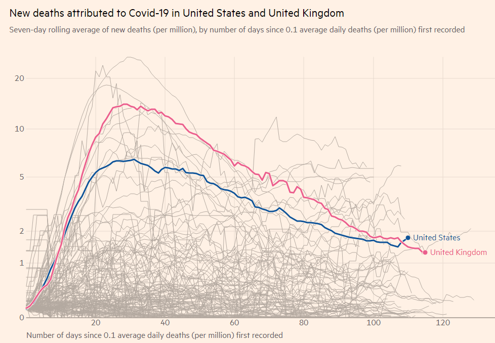 Per million, the seven-day rolling average in the US has surpassed that of the UK: