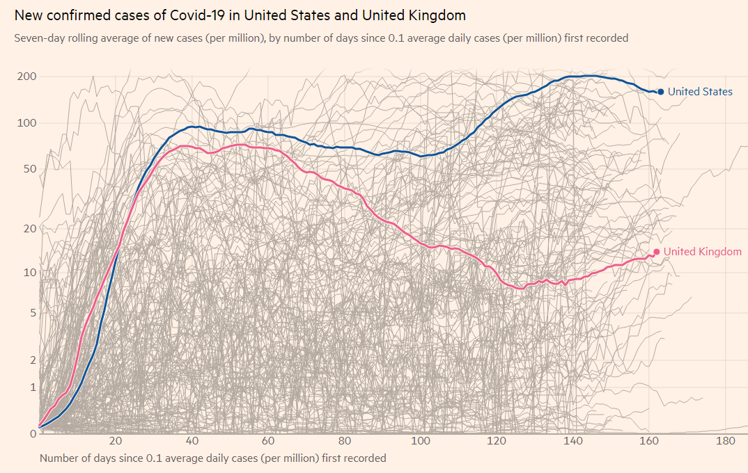 UK coronavirus cases continue moving higher, while they are showing tentative signs of falling in the US. Nevertheless, America's situation remains far worse.