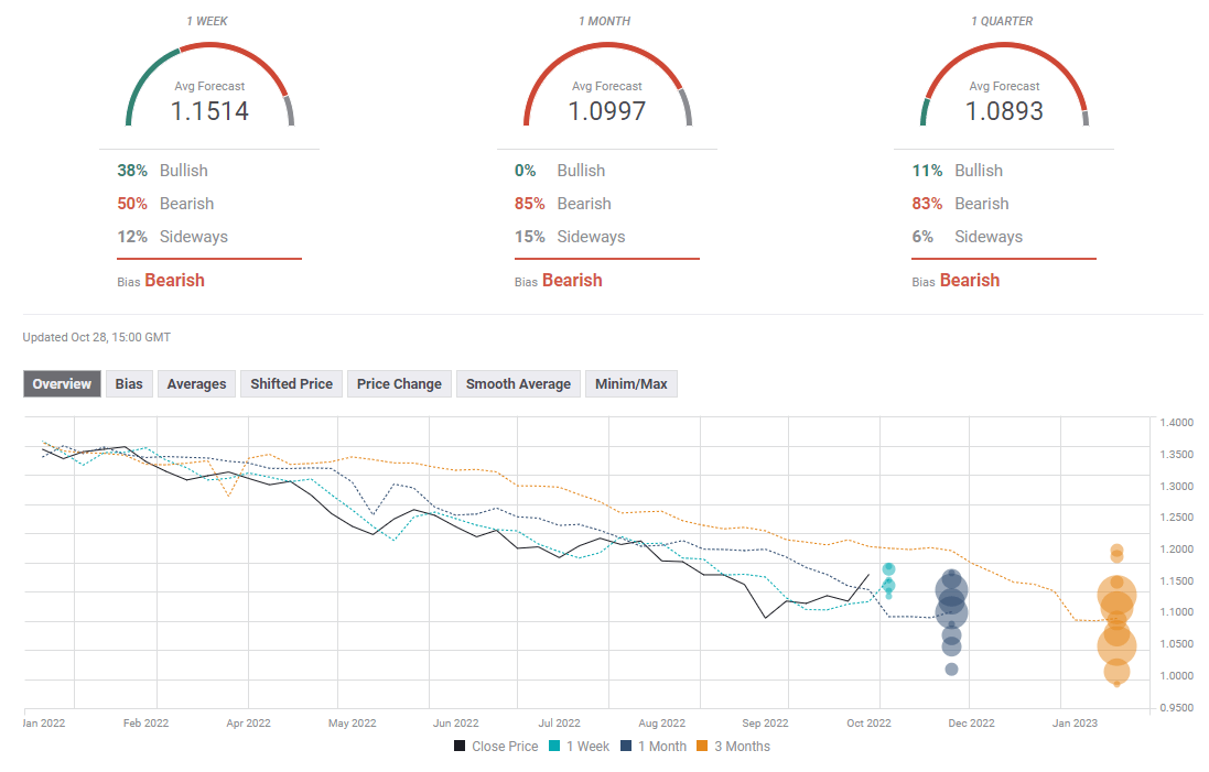 Experts polled by FXStreet seem sceptical about GBP/USD's bullish potential in the medium term with the one-month average target aligning at 1.0997. The one-quarter outlook also paints an overwhelmingly bearish picture with a large number of experts seeing the pair trading below 1.1000 by early 2023.