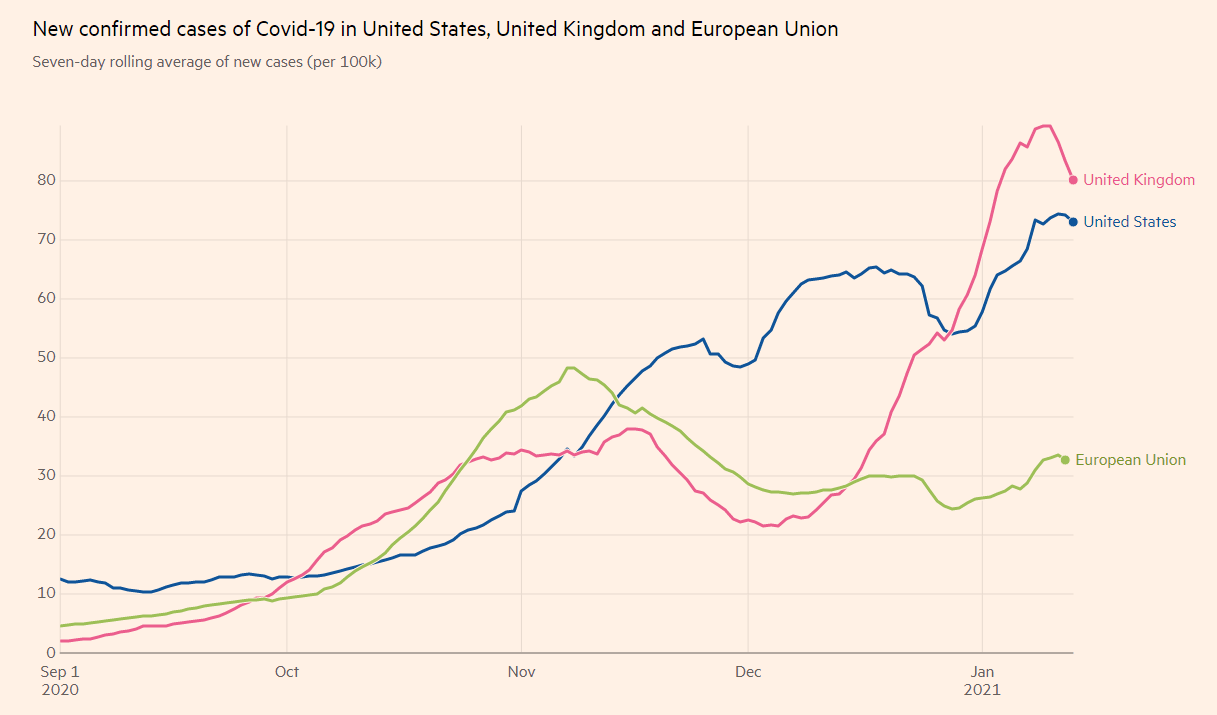 Another positive factor for sterling was a drop in UK coronavirus cases. The harsh lockdown effect – to fight the new, highly transmissible variant – is bearing some fruit. Unfortunately, deaths remain high on both sides of the Atlantic.