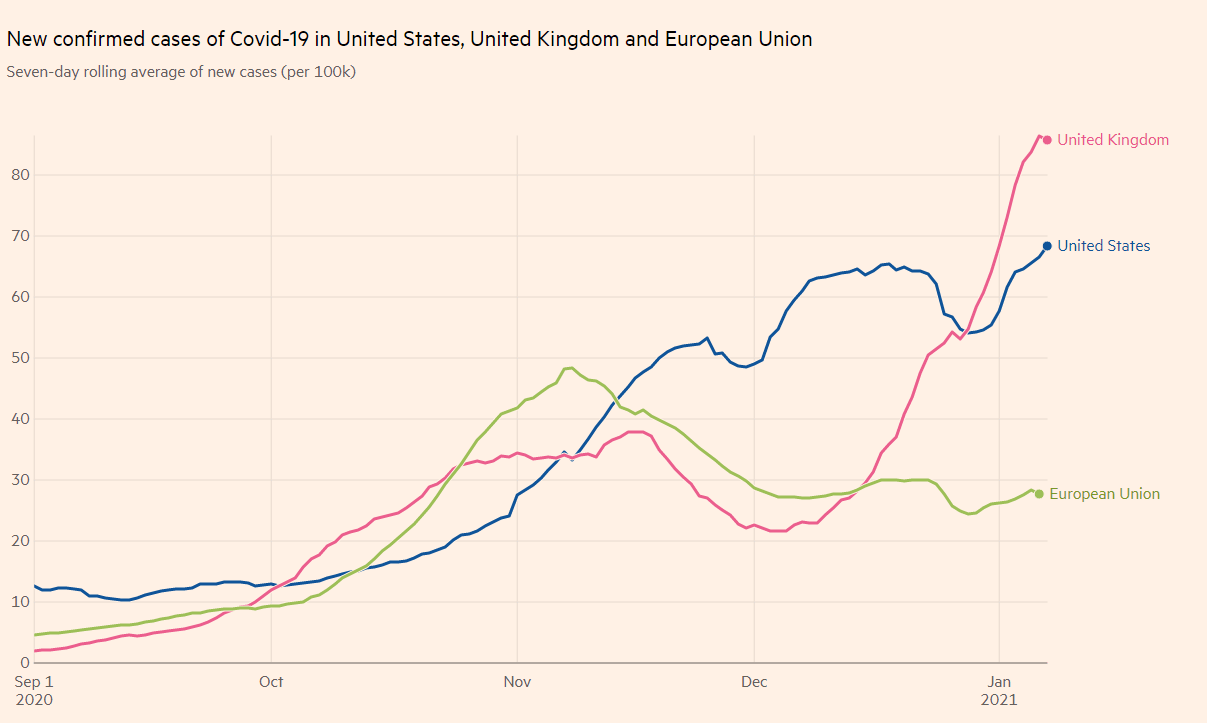 America's coronavirus situation is similar – a holiday-related increase in covid statistics and anger at insufficient vaccine inoculations. The US is injecting Moderna's jabs in addition to those by Pfizer.