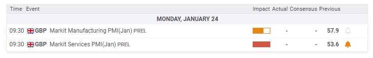 After a week of top-tier releases, the UK calendar is lighter again, with only Markit's preliminary Purchasing Managers' Indexes for January standing out. The Services PMI is of particular interest, as Britain's largest sector. A decline toward 50 – the threshold separating expansion from contraction – would weigh on the pound.
