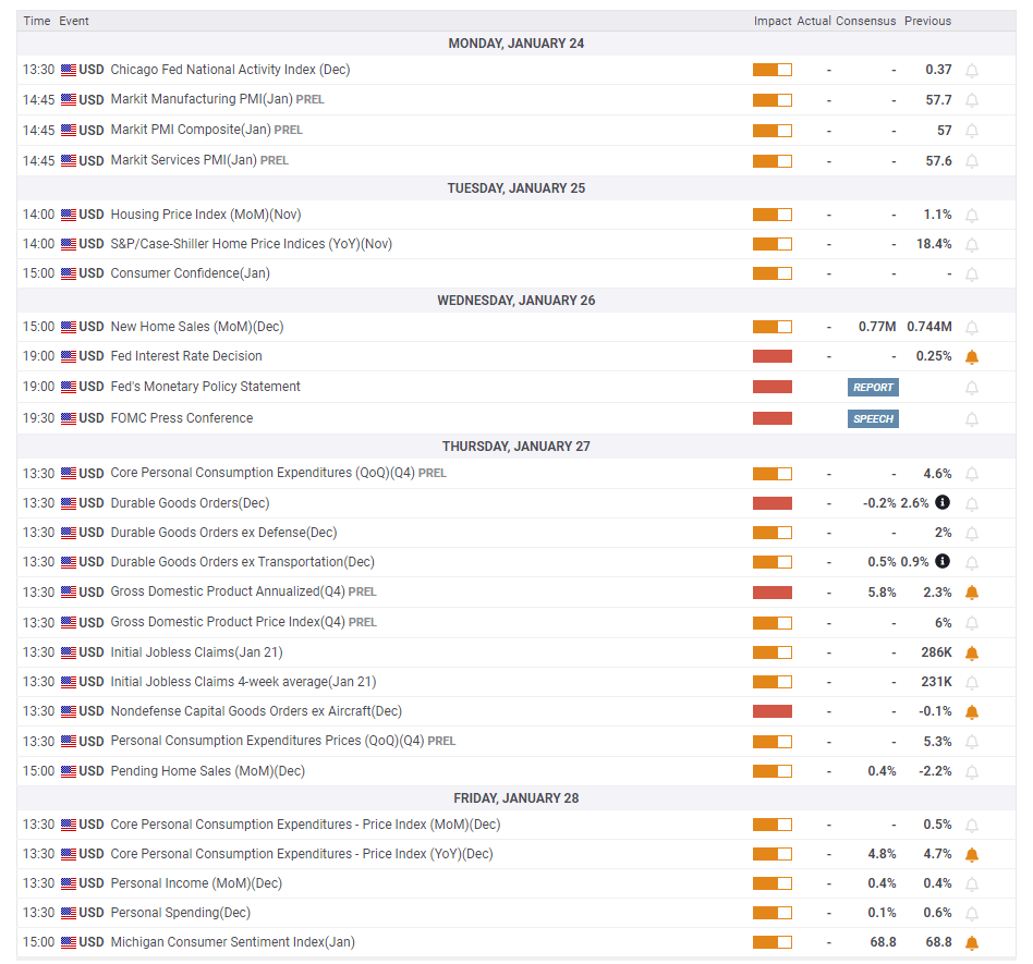Trading in the last week of January will be centered on the first Federal Reserve decision of 2022. The consensus is for no change in rate hikes at this juncture – but one coming in March, when the bank's bond-buying scheme expires. Some suspect that higher inflation could push Chair Jerome Powell and his colleagues to end purchases already in January.