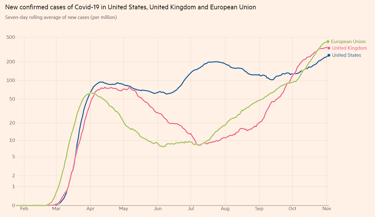 COVID-19 cases have been flattening in Britain, providing hopes that the lockdown would not last for too long. Prime Minister Boris Johnson made a complete U-turn by announcing a second nationwide shuttering, contrary to previous statements. In the US, they continue rising.