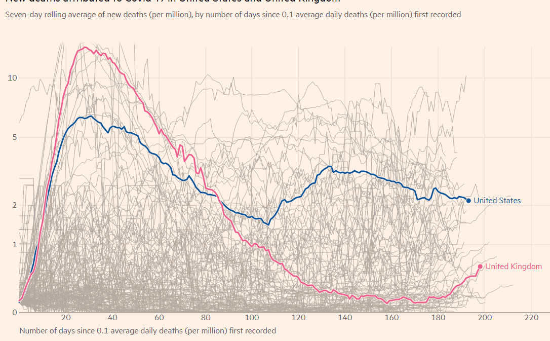 COVID-19 mortalities are also moving up in Britain, but remain below America's levels on a population-based comparison.