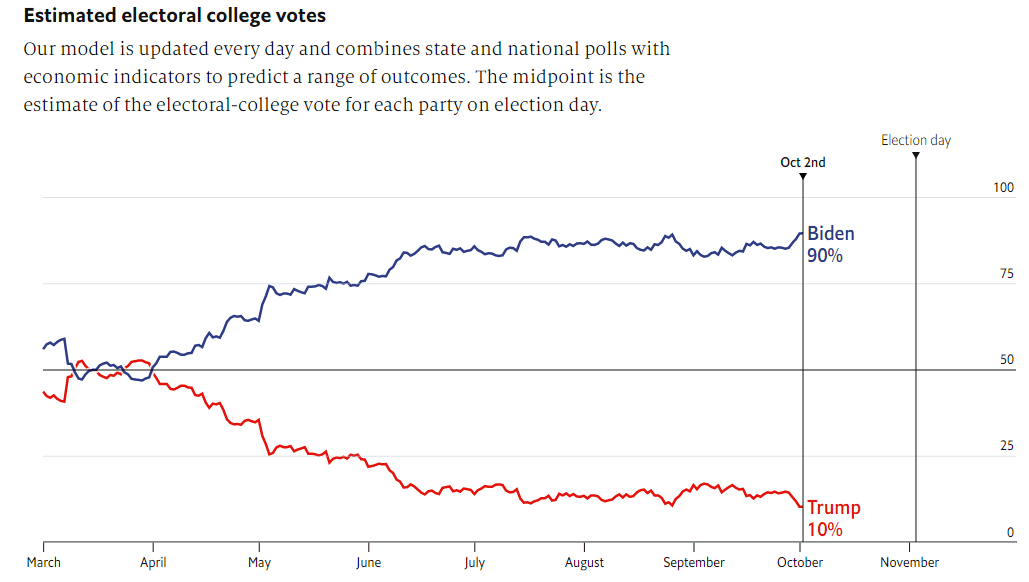 The Economist magazine also runs a model, which is showing an even greater probability of a Democrat win – 90%.
