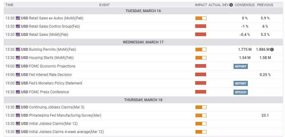 Ahead of the Fed decision, US Retail Sales figures due are of high interest, as the US economy is centered on consumption. After a whopping leap of 5.3% in January, headline sales and also the control group – aka "core of the core" – have likely declined in February. Nevertheless, support from the previous stimulus package could result in another positive month and boost the dollar.