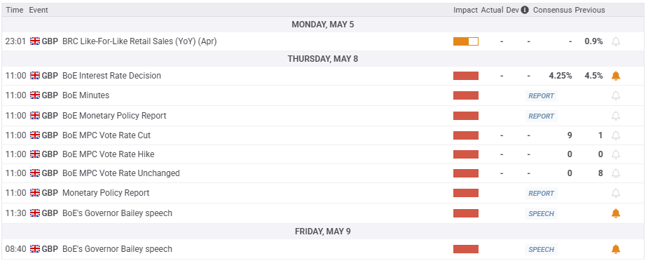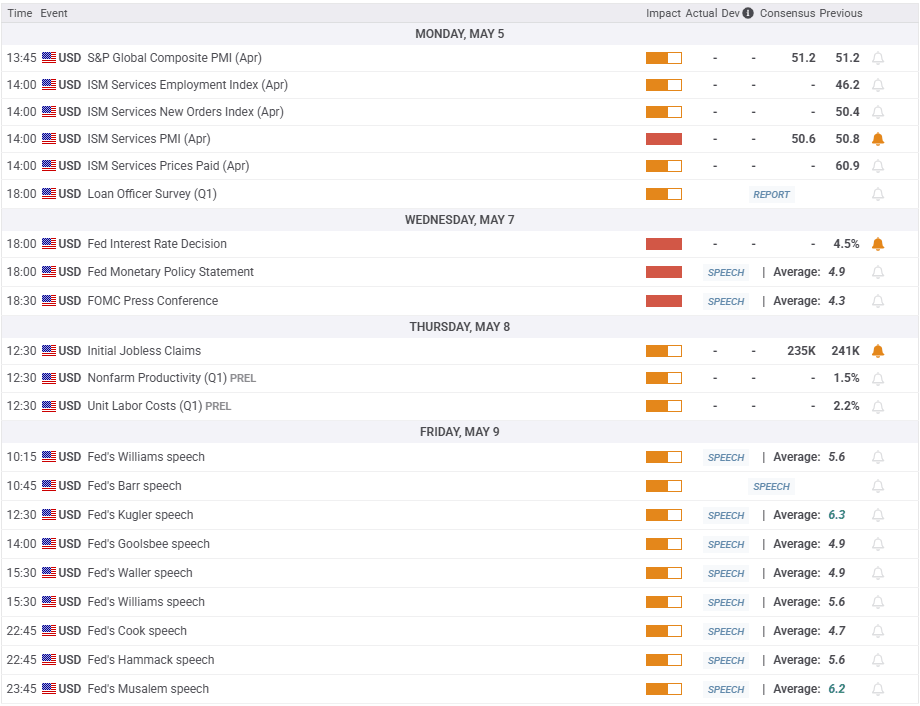On Monday, the US ISM Services PMI will be of note for the major as the UK markets will remain closed in observance of May Day. Tuesday lacks any top-tier UK or US macro news, so all eyes turn toward Wednesday’s Fed interest rate decision.