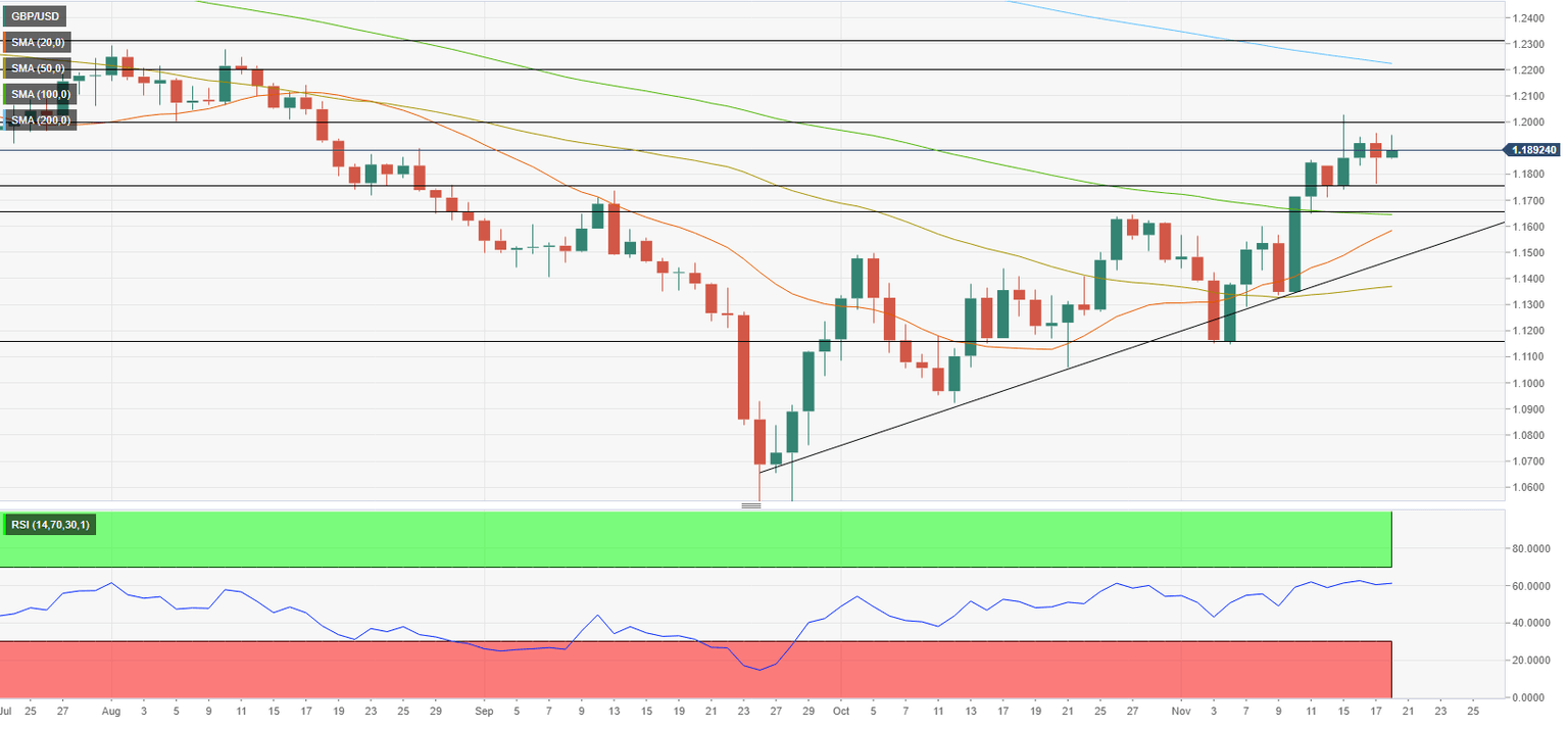 The Pound Sterling pair returned to the green zone on Friday, as the US Dollar lost its recovery momentum, courtesy of the sell-off in USDJPY. Japan’s Consumer Price Index surged to a 40-year high and fanned expectations of a hawkish Bank of Japan (BoJ) pivot, putting a bid under the Japanese Yen at the USDJPY’s expense. However, the choppy price action in the US Dollar continued, leaving GBPUSD in a familiar range at around 1.1900, even though the United Kingdom Retail Sales data came in mixed for October. The UK Retail Sales arrived at 0.6% MoM in October vs. 0% expected and -1.5% previous. The core retail sales, stripping the auto motor fuel sales, rose 0.3% MoM vs. 0.6% expected and -1.5% previous. On an annualized basis, the UK retail sales plunged 6.1% in October versus -6.5% expected and -6.8% prior.