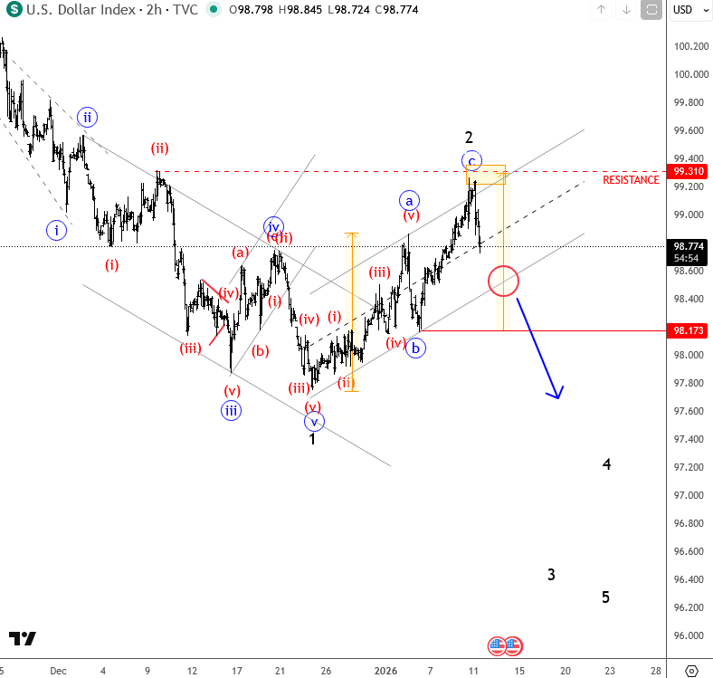 As you know, the market turned a bit lower at the start of this new trading week, first due to political pressure from Trump on Powell and the Fed, and also because of rising concerns around potential military actions involving the US and Iran. All of this is shaping sentiment, which for now looks slightly bearish. But despite stocks turning lower, we are also seeing the dollar coming lower. Because if trust in the US system is lost then the dollar can weaken regardless of what stocks are doing. Looking at the dollar, we can see a very nice reversal so far, with a potential breakout still pending out of the corrective channel near 98.50. Such a move could open the door for a much stronger push lower on DXY. Of course, it would be much easier for the dollar to resume lower if stocks start to stabilize, which often happens by Tuesday when sharp Monday flows fade.