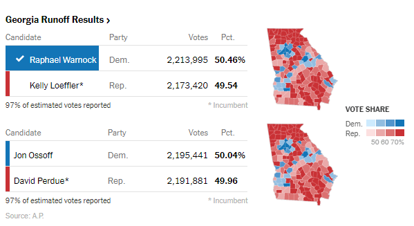 At the time of writing, Democratic candidate Raphael Warnock has already been declared the winner by the networks. He is up by 0.96% against Republican Senator Kelly Loeffler. The second race is closer, with GOP Senator David Perdue trailing Democratic challenger Jon Ossof by 0.08%.