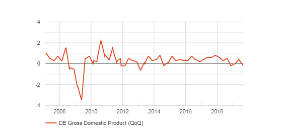 Economic growth was -0.1% in the second quarter after registering 0.4% in the first three months of the year. With a second negative reading expected in the quarter just ended Germany may enter its first recession since 2008-2009.