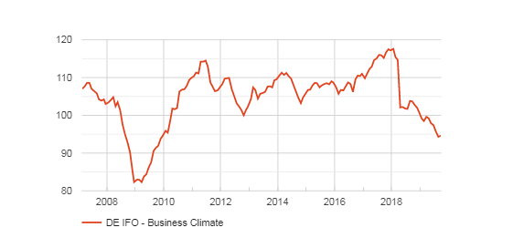 Germany’s export driven economy has seen a steep decline in optimism over the past two years that began soon after the start of the China US trade dispute in January 2018.