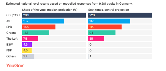If current polls are correct, the CDU/CSU Party will likely win the election and Friedrich Merz will become the next Chancellor. However, as I am sure you are aware, it is doubtful that one Party will secure enough seats to form a government; hence, a coalition must be formed, which could drag on for months. Of note, for a coalition to be established in Germany, over 50% of the seats in the Bundestag need to be held.
