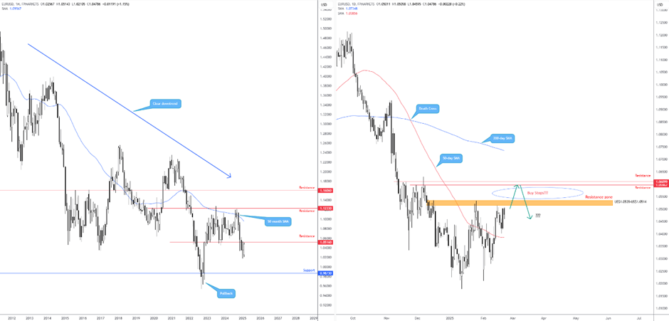 From the monthly chart, resistance is at US$1.0516, with scope for further underperformance towards support as far south as US$0.9873 (below parity). Couple this with a possible whipsaw forming above a resistance zone on the daily timeframe between US$1.0535 and US$1.0514 into resistance at US$1.0610-US$1.0597, I feel strong sellers could emerge from such a setup and force the EUR/USD southbound.