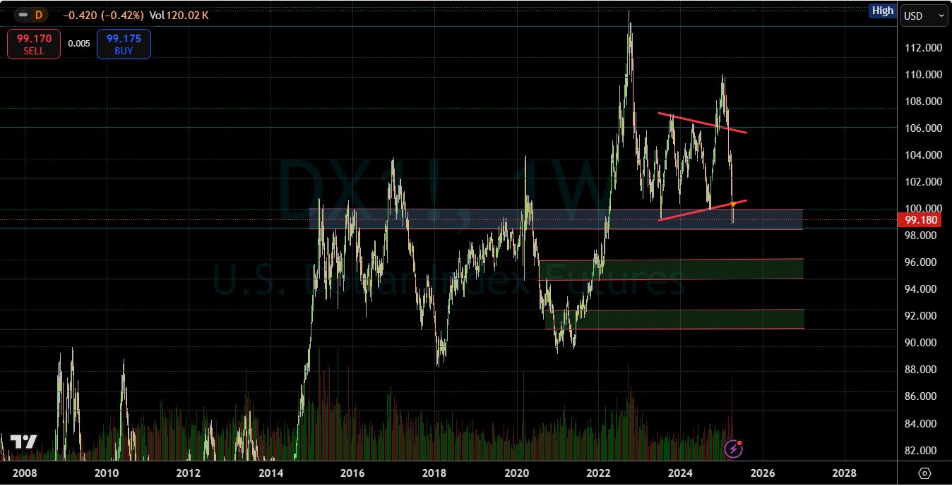 The DXY hovers at a decade-defining level, struggling to reclaim the 100 zone. It trades in the midpoint of a 10-year price cycle and looks vulnerable, especially under macro pressure from a weakening yield curve, trade war escalation, and deteriorating global sentiment toward US assets.