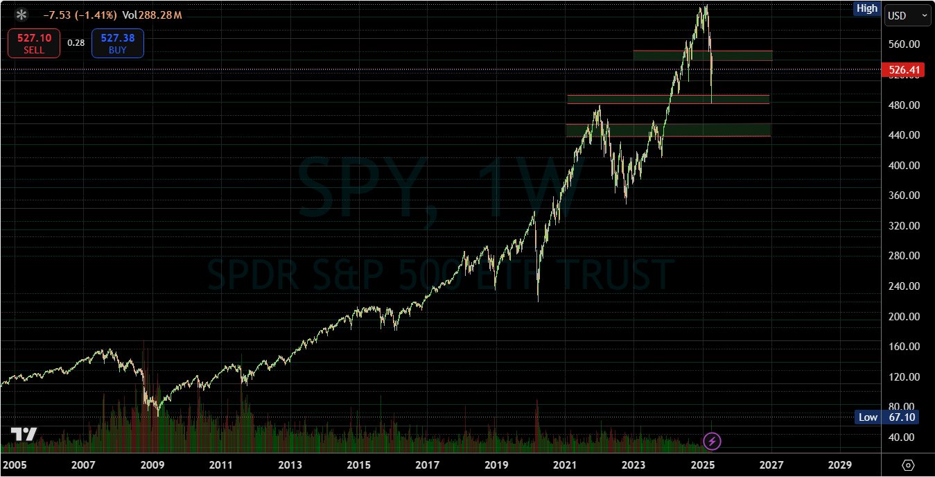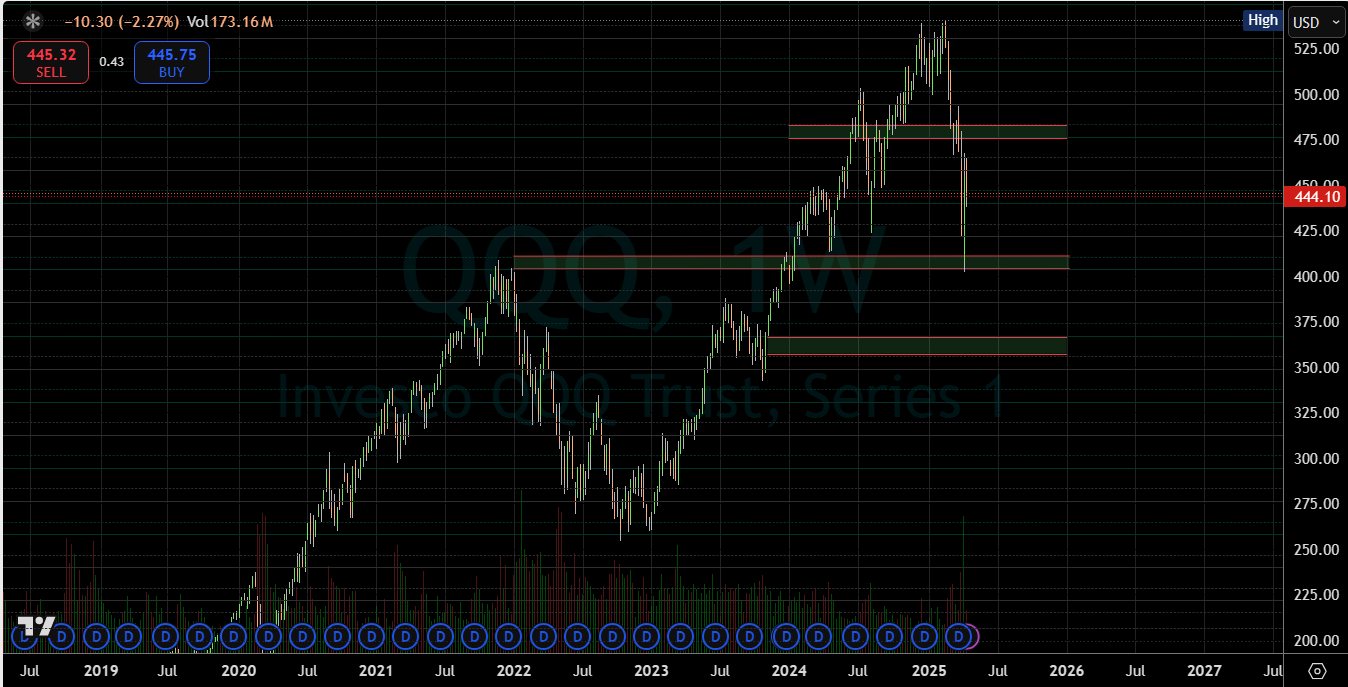QQQ's rebound peaked at 465, failing to reach key resistance at 476. Support lies at 440, 428, 421, 410, 404, and deeper zones at 367 and 356.