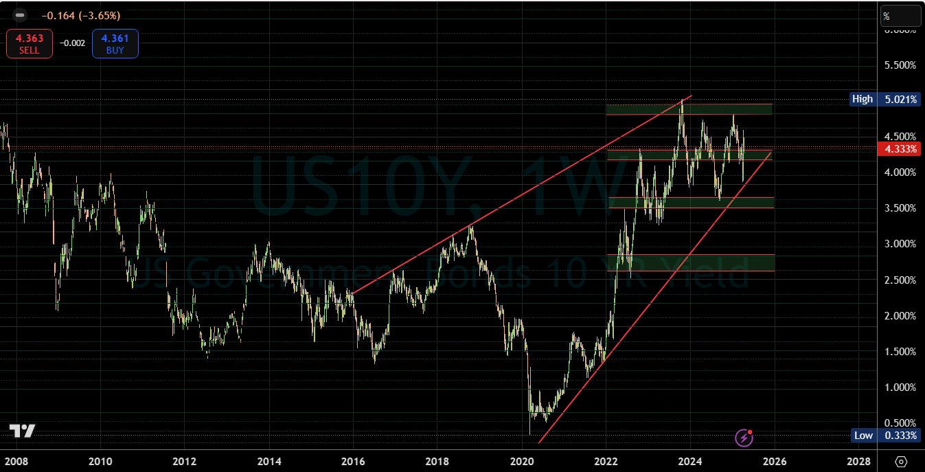 The 10-year yield is contained within a decade-long rising wedge pattern, a structure known to resolve into trend reversals. Since the pandemic low of 0.333% in March 2020, yields climbed to 5.00% in October 2023, marking a historic bear market in bonds. The current level near 4.20% is significant—it's a Fib confluence zone (23.6%) and a retest of the March 2025 breakout area.