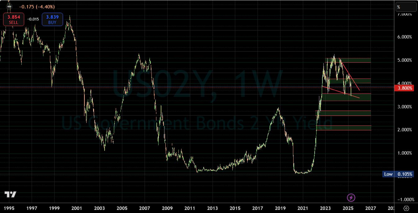 The 2-year yield currently trades at 3.805%, unfolding within a well-defined three-year falling wedge pattern. This formation follows an extraordinary surge from 0.105% in January 2021 to 5.283% in October 2023—reflecting rapid Fed rate hikes and inflation expectations. The 4.00% level, which aligns with the Fibonacci 23.6% retracement, has been tested multiple times, indicating it as the immediate battlefield for bulls and bears.