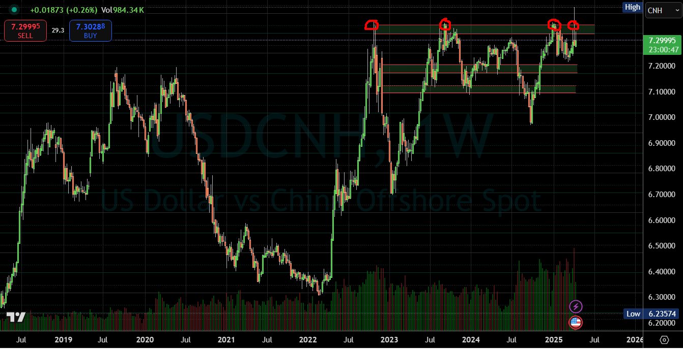 USD/CNH is at the centre of the tariff war. A three-year resistance zone near 7-35/7-32 has failed once again. This repeated failure shows strategic resistance by Chinese policymakers or macro selling pressure.