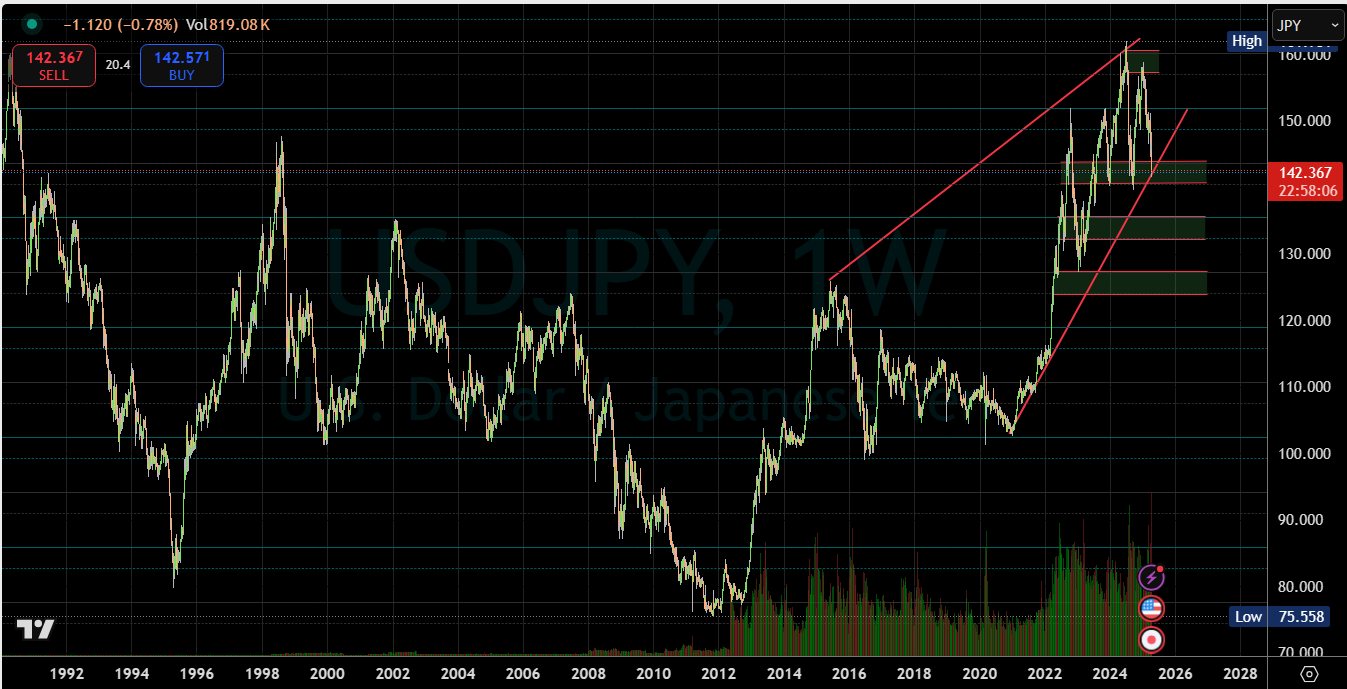 Structural breakdown: If 140 is lost, the potential downside opens to 135, 132, and 127. The last time this pair broke similar structural levels was in 2016–2017, during a major dollar correction.