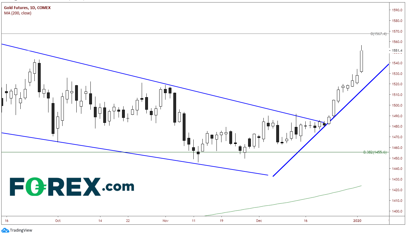 Regardless of the situation between the US and Iran, Gold has been moving higher for two weeks. Some may attribute it to year end or an overbought stock market. Whatever the reason, Gold has broken out of a beautiful pennant formation and appears to be heading towards the target!