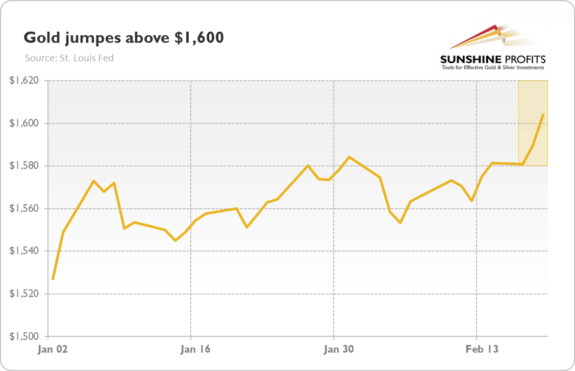 Gold bulls can be happy. As the chart below shows, the yellow metal has jumped above $1,600 amid the FOMC minutes and concerns about the coronavirus. Let’s now analyze these two important developments.