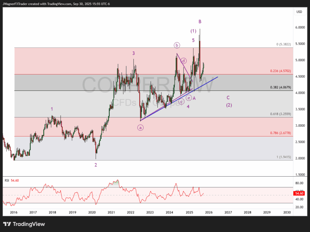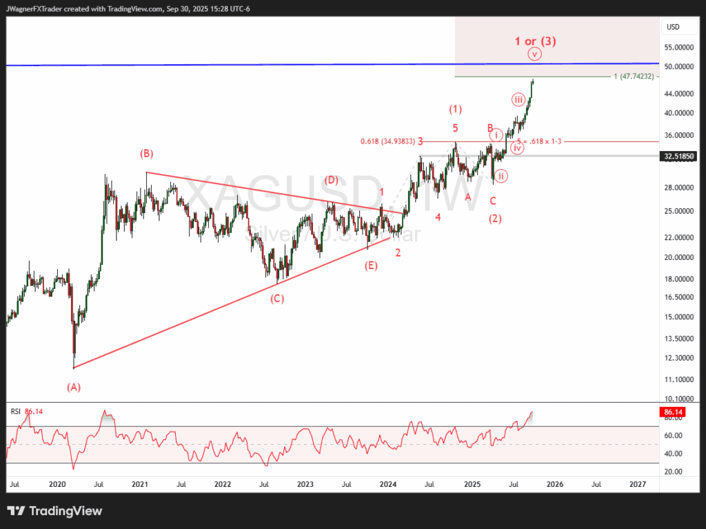 The rally beginning April 2025 is either wave 1 of (3) or all of wave (3). Under both scenarios, the pattern is incomplete to the upside.