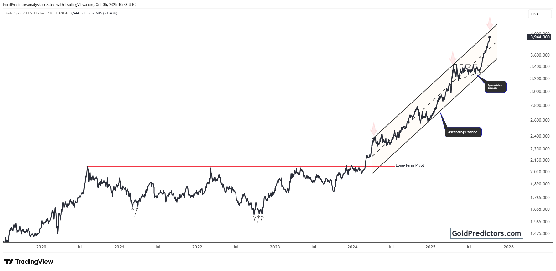Since then, gold has established a well-defined ascending channel that has remained in place for over a year. Within this structure, the price has climbed steadily, consistently reacting to both support and resistance levels. A symmetrical triangle later formed within the channel, serving as a classic consolidation pattern. The breakout from this formation sparked a sharp rally, pushing gold above the $3,800 level.