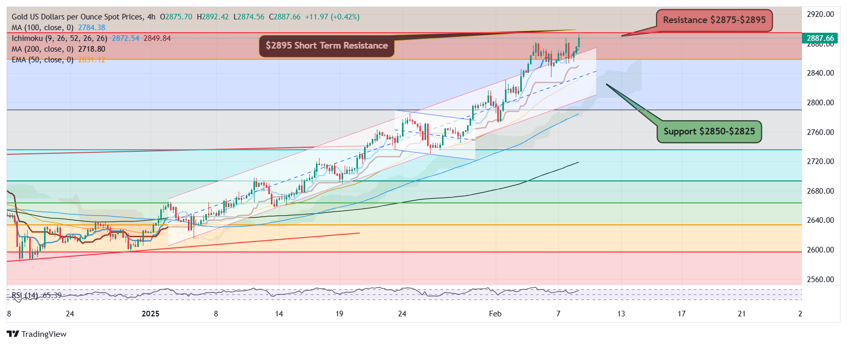 Gold continues to attract safe haven buying as $2850 provided strong upmove triggering sharp rally to $2892, a short distance from immediate resistance $2895 according to fibonacci extension as the metal trades into unchartered territory.