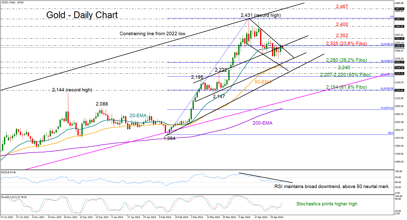 Gold had a positive start to the week, bouncing back above its 20-day exponential moving average (EMA), but the bullish attempt was not strong enough to drive the precious metal successfully above the constraining zone of 2,325. This is where the 23.6% Fibonacci retracement of the February-April uptrend and a former restrictive line are placed.