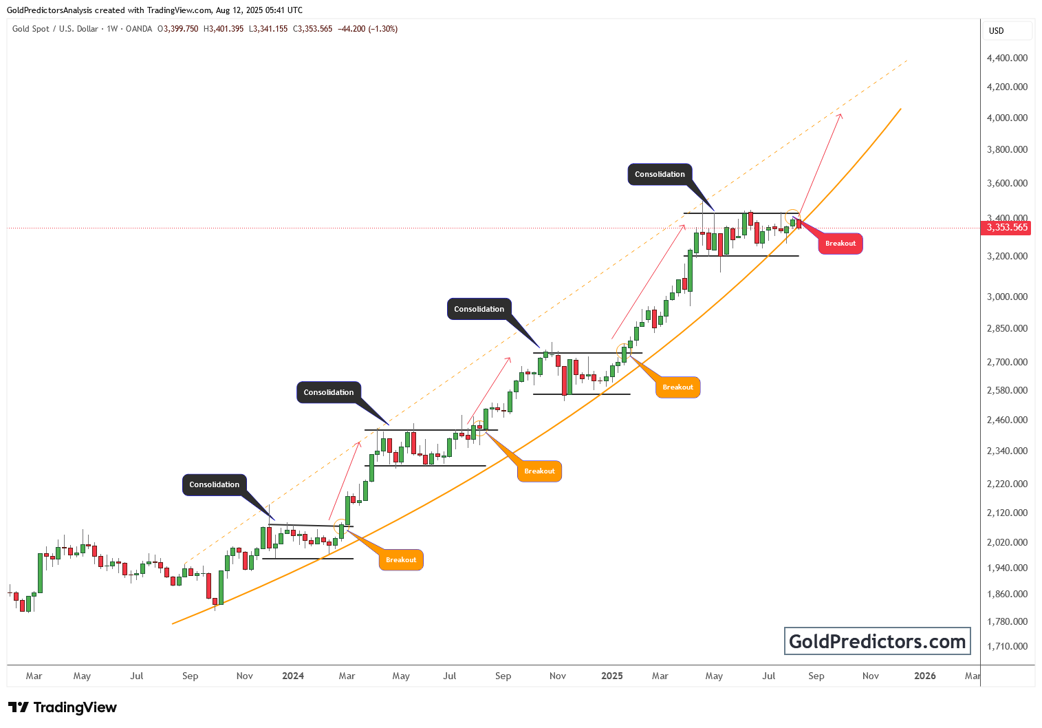The gold chart below shows a solid long-term uptrend, with prices climbing along a rising curve since late 2023. This trend has seen multiple consolidation phases, each followed by bullish breakouts. The first consolidation occurred in late 2023, after which price broke higher and began a steady climb along the rising trendline.