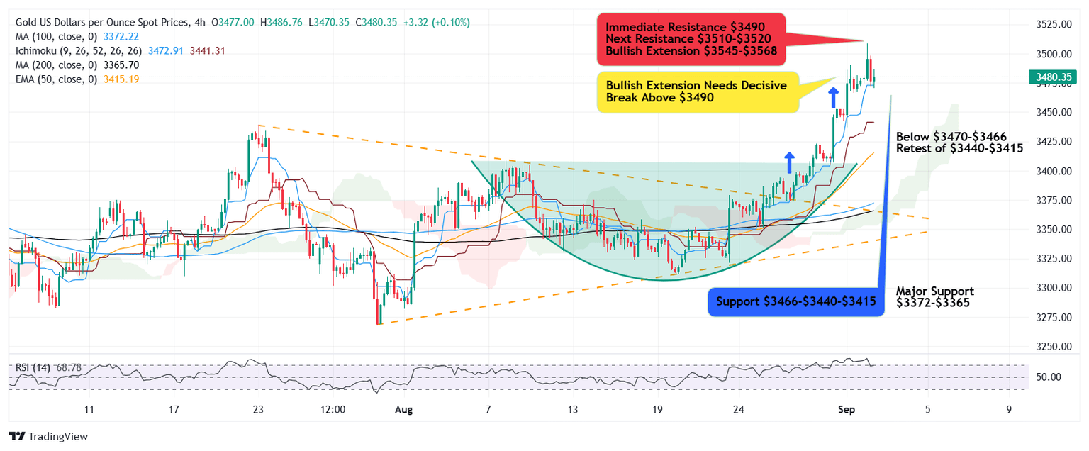 A strong break above $3495 will revisit $3500 followed by $3509 above which next upside target sits at $3521 followed by $3545.