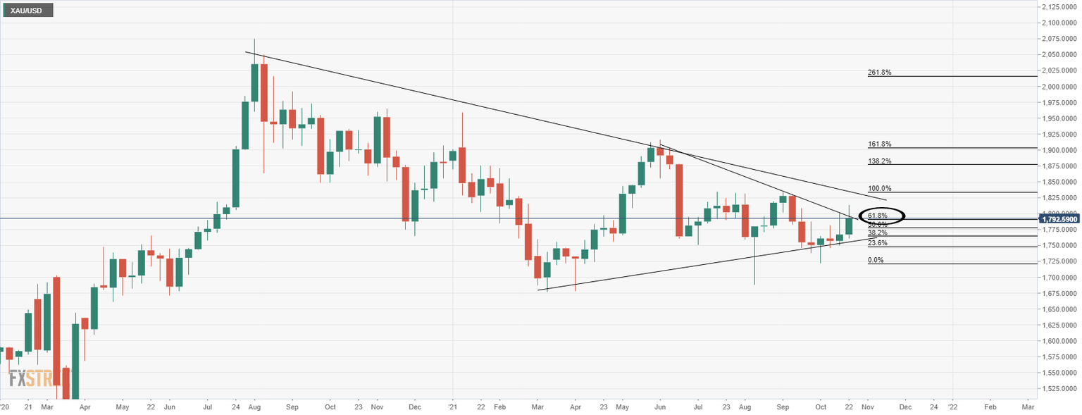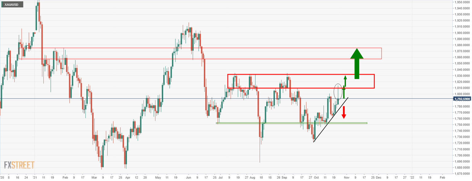 From a daily perspective, the price is attempting a move higher, as Friday's price action shows, and the wick's high of the candle is a likely target for the sessions ahead. $1,835 guards territory to $1,880 as follows: