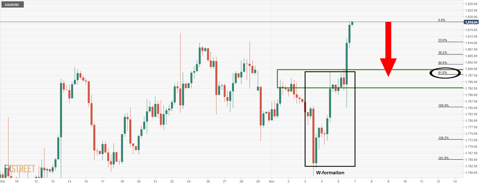 The 4-hour chart shows that there is a 61.8% Fibonacci confluence with the prior resistance that could well come under pressure for the week ahead should there be a significant correction. This comes in near 1,797. It is also noteworthy that the 4-hour W-formation drew in the bears to 1,785 on Friday before the spike to the fresh highs.