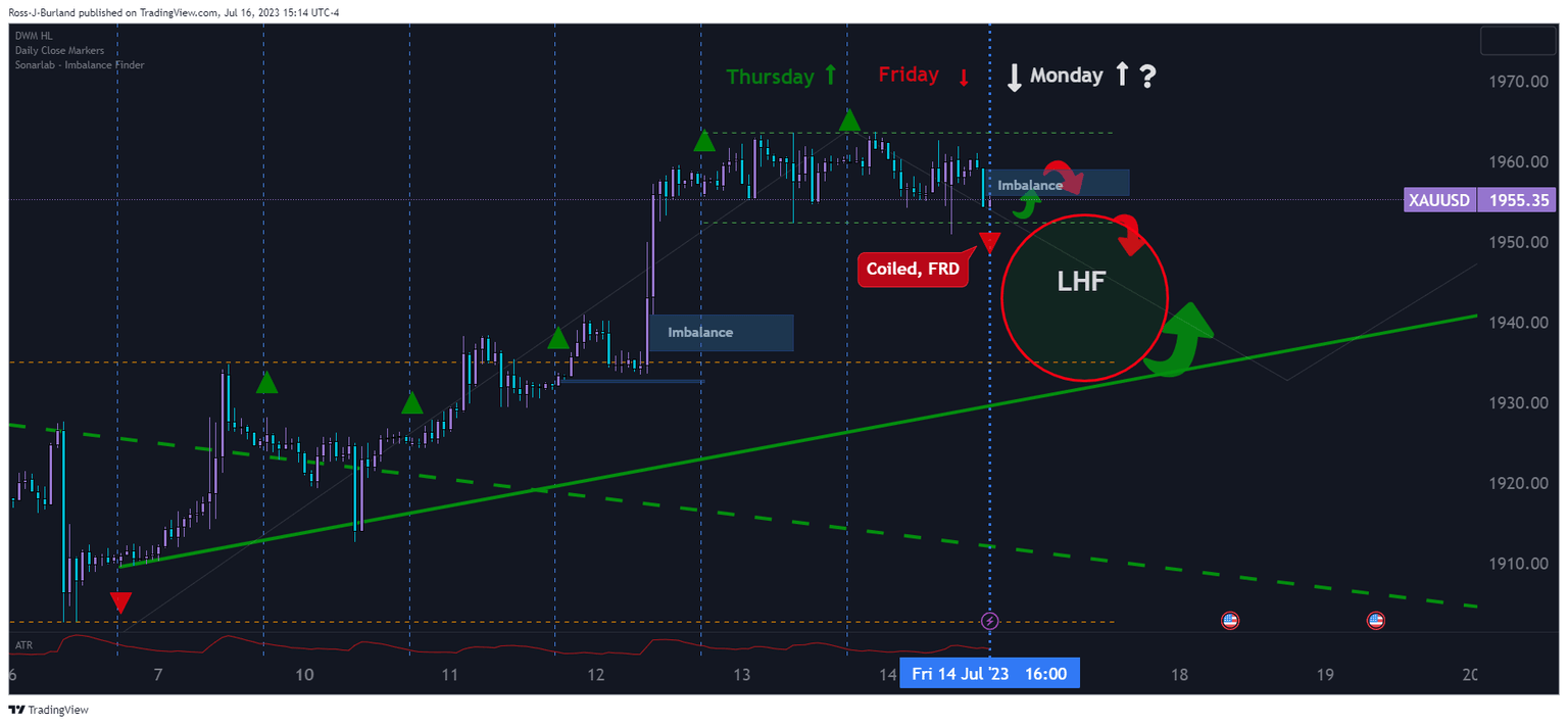 The market is coiled between Thursday's highs and lows and a breakout is on the cards. We have an imbalance of price to the upside, which might see the Gold price rally before the thesis's downside can play out.