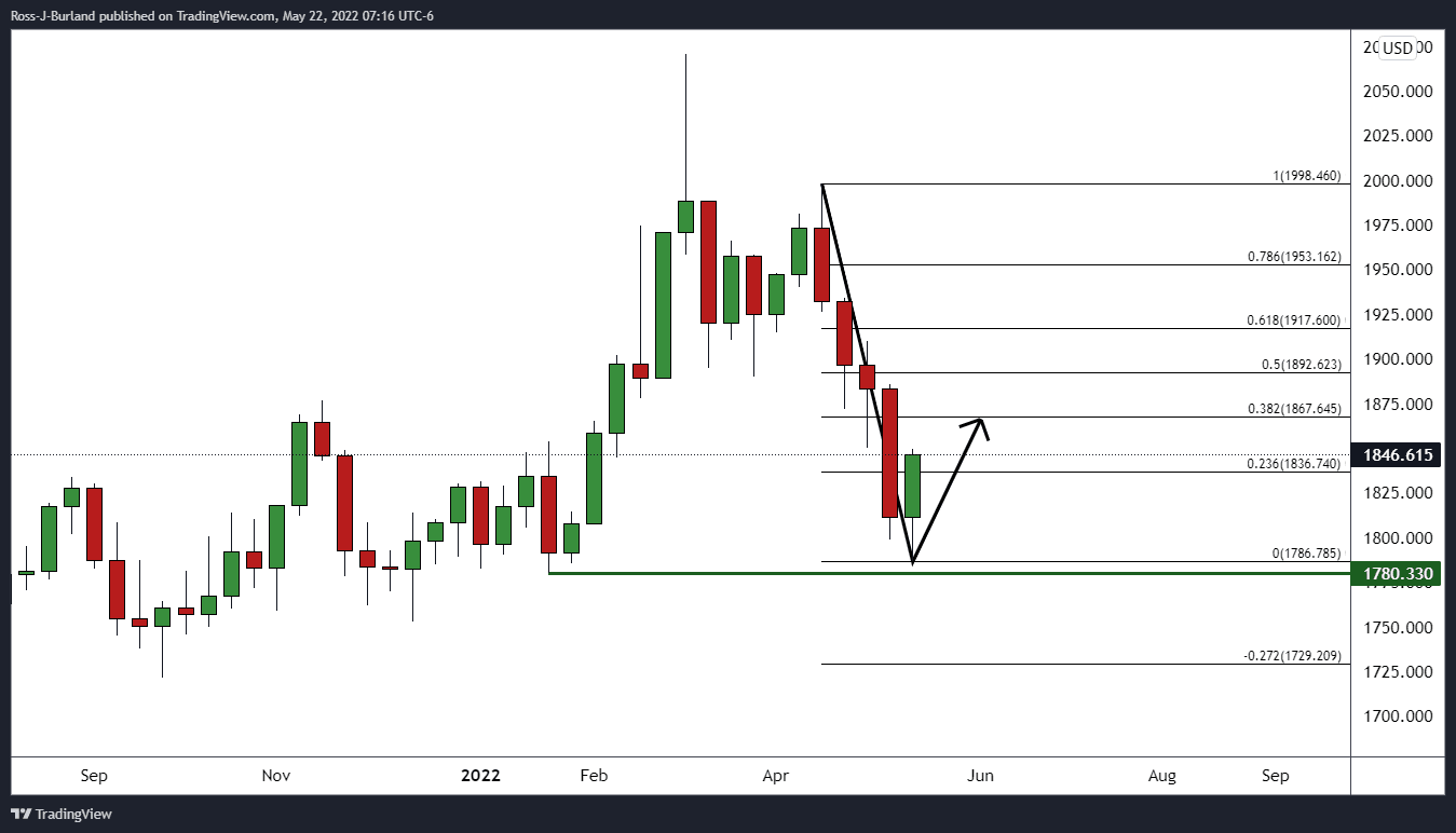 ''The price has carved out a W-formation. This is a reversion pattern and the price would be expected to restest the neckline in due course. However, a break of the resistance near $1,860 will be needed to open the pathway toward the 50% mean reversion target on the weekly chart for the days ahead.''