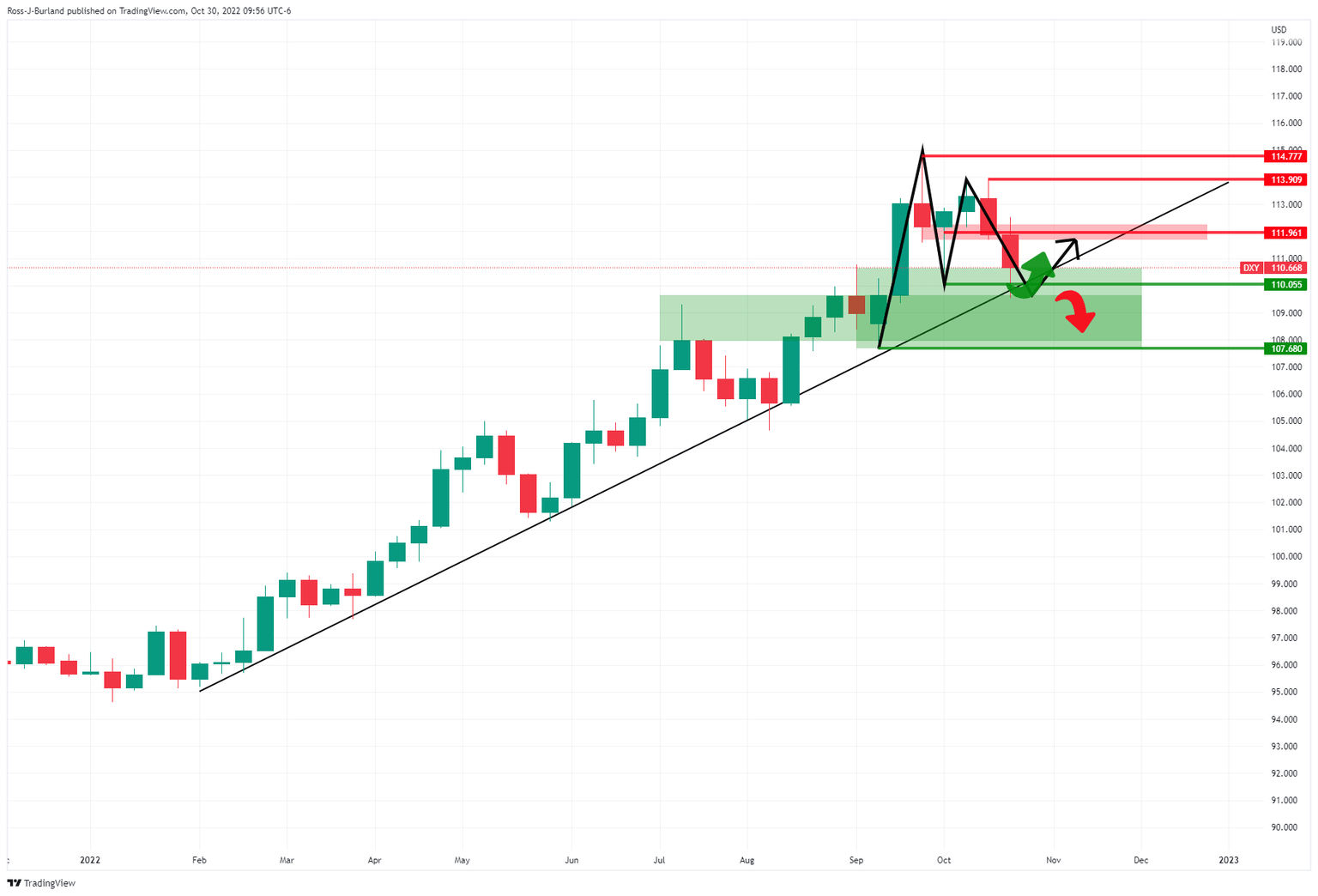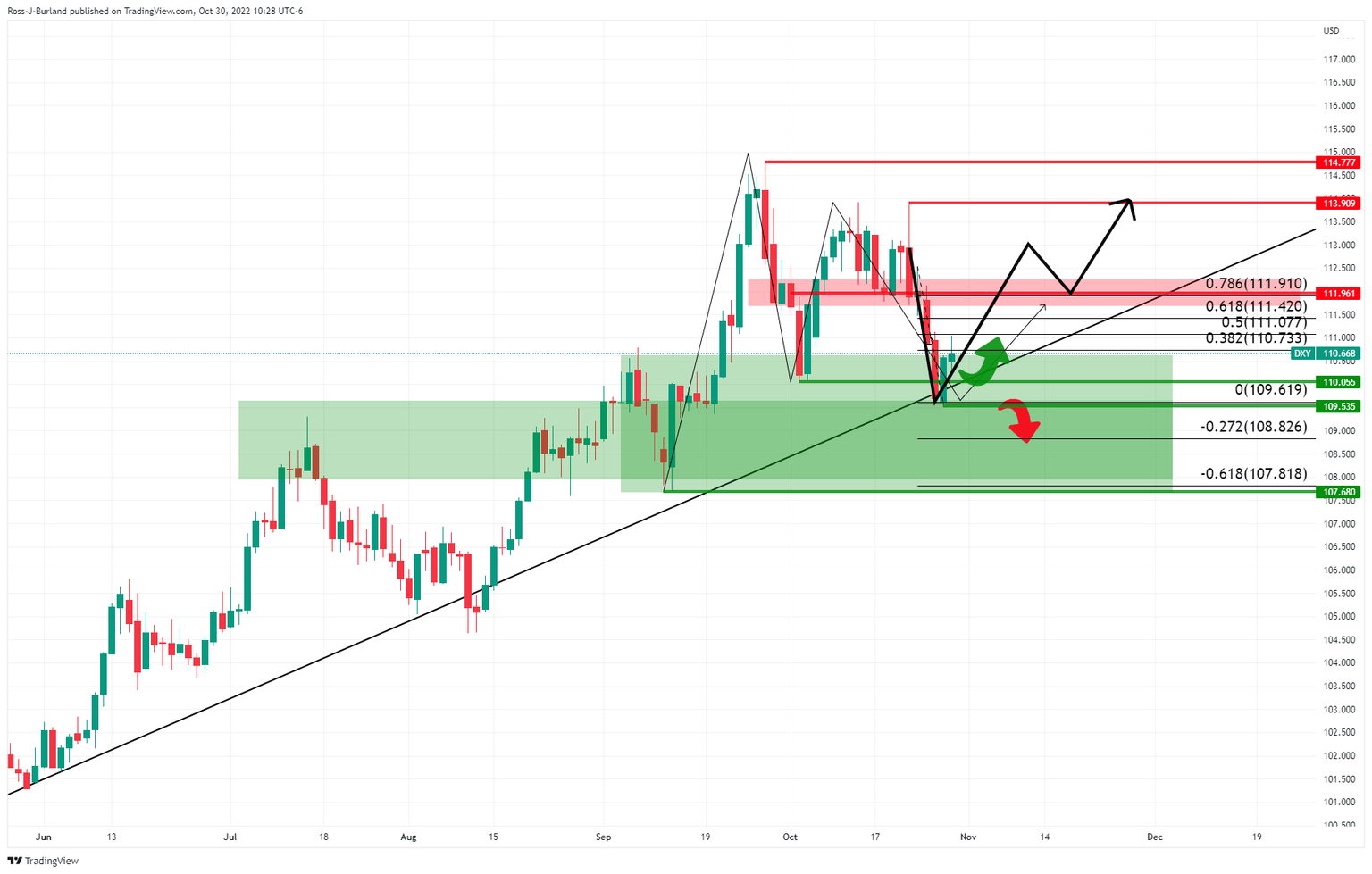The price, as per the W-formation on the weekly chart, could be still in its evolution in terms of the downside with room to go to test between 107.70s and the 109.50s. However, for now, the index is being rejected from familiar trendline support and if we zoom down to the daily chart, the rejection is powerful which may mean there is more to come from the bulls in the days leading into the Fed. A break of 112.00 could be significant in this respect: