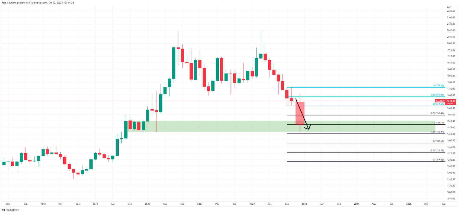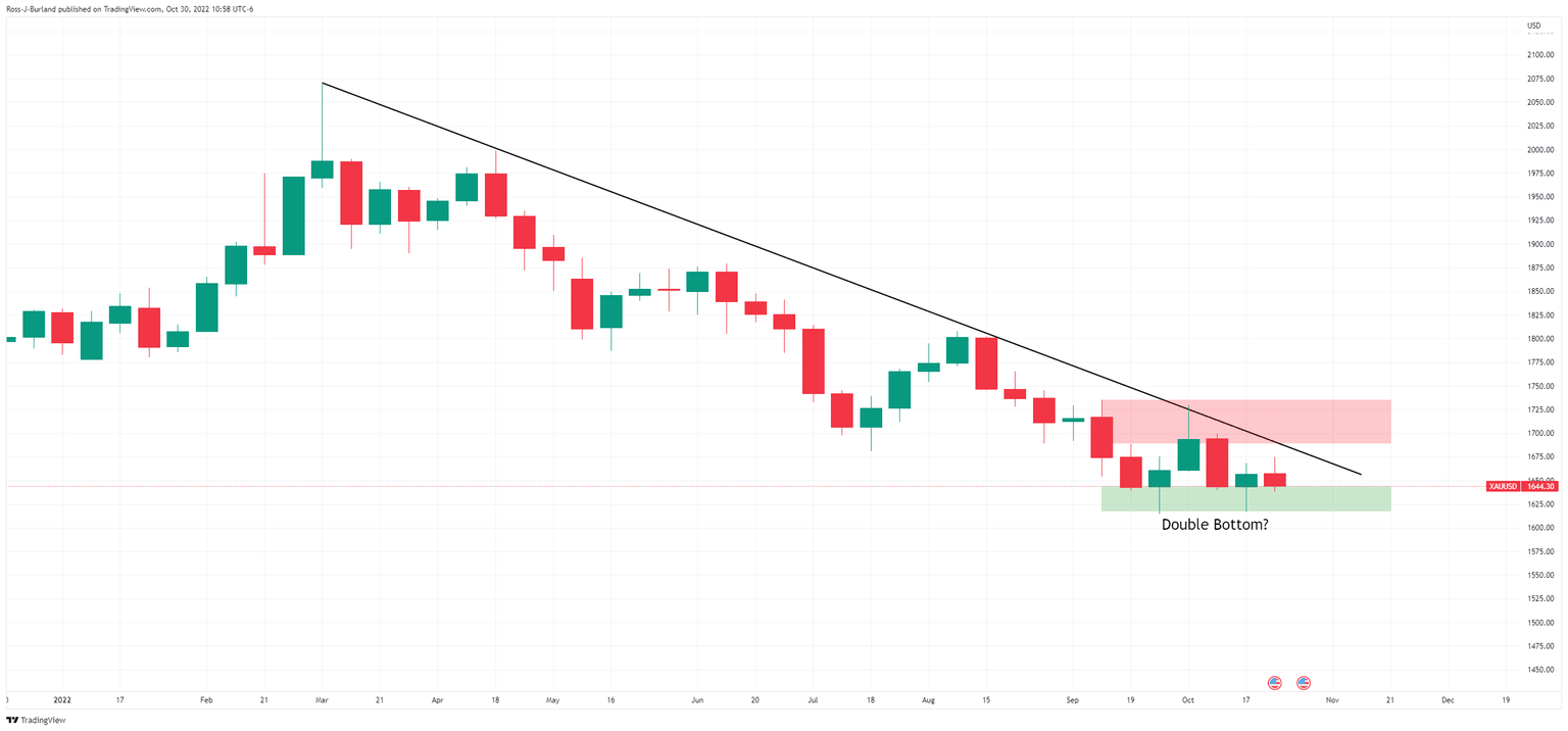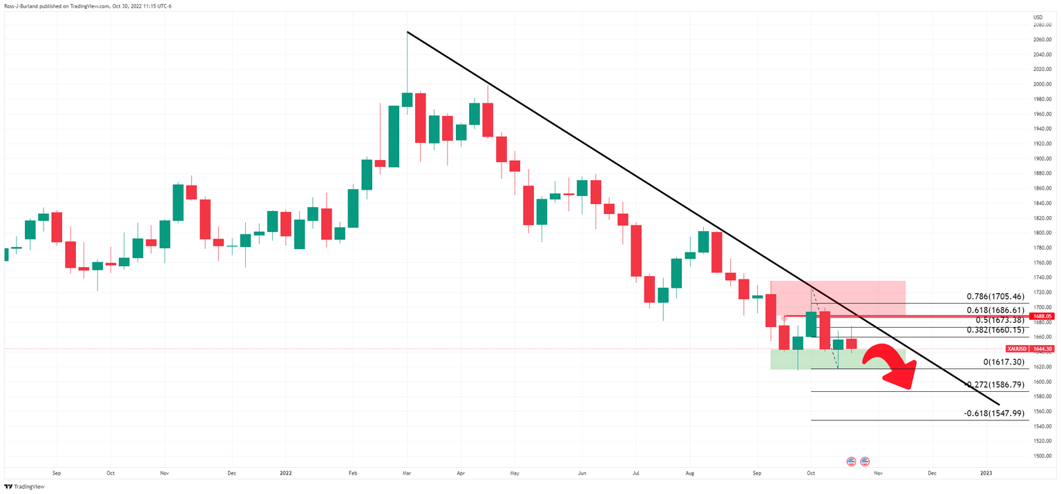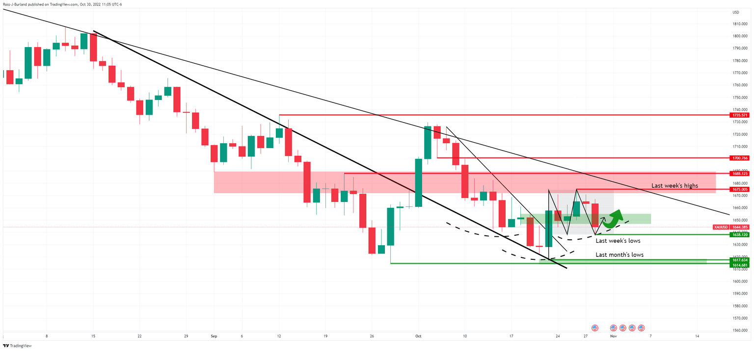Gold closed within last week's range on Friday, firmly back into the hands of the bears as the US dollar hung on into bullish territory despite declining for the second straight week, pressured by growing expectations that the Federal Reserve will turn less aggressive soon. Gold ended at $1,644.38, down some 1.14% falling from a high of $1,667.11 and falling to a low of $1,638.12. The DXY index, which measures the greenback v.s a basket of currencies fell to a low of 110.288 and backed up again from key trendline support, thus will it remain vulnerable to the risk events ahead this week.