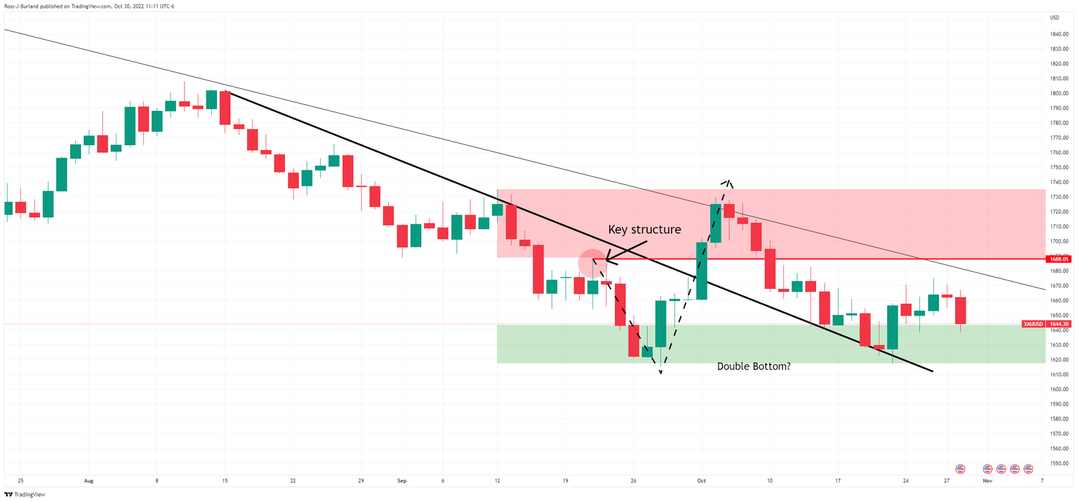 On the daily chart, the M-formation might only be in its early stages of development, but nonetheless, it's there and the price could move beyond last week's highs of $1,675 which could potentially signify that the inverse head and shoulders are in play. This will leave a focus on a break of the trendline resistance and then a critical structure of $1,688: